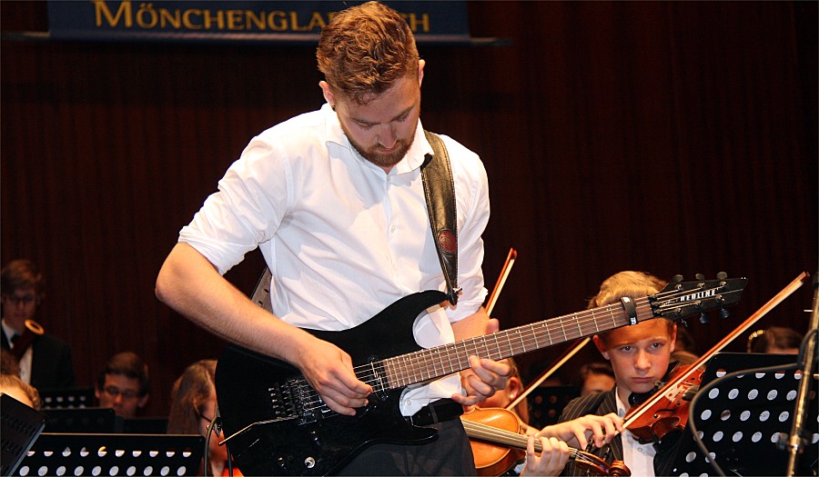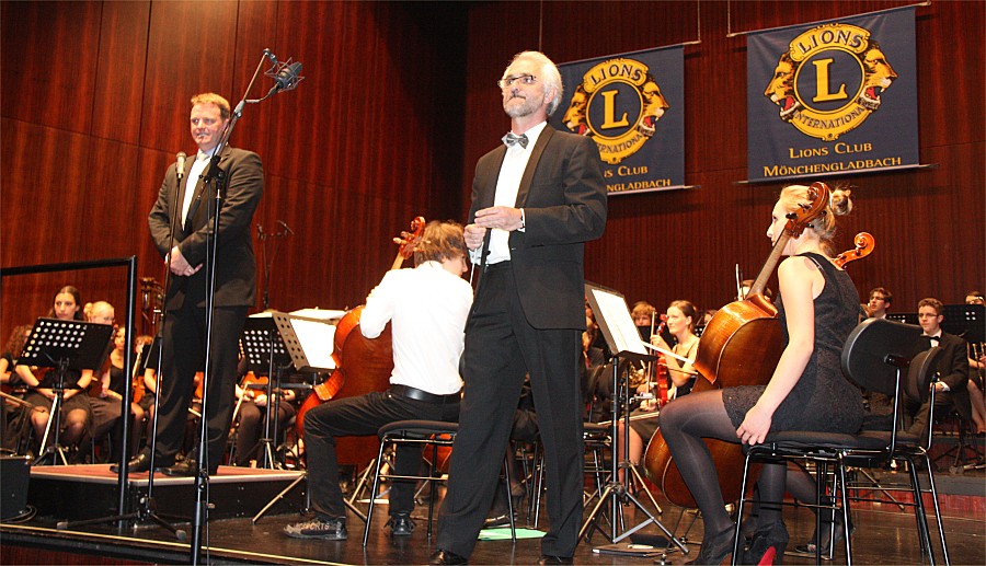 ![]() Der diesjährige Präsident des Lions Clubs, Christian Achter (links), freut sich über das große Interesse am Jugendsinfonieorchester und die zahlreichen Besucher des Benefizkonzertes. Nach einer kurzen Begrüßung übergibt er an Christian Malescov, dem Leiter der Musikschule Mönchengladbach, der das Orchester mit sicherer Hand führte.