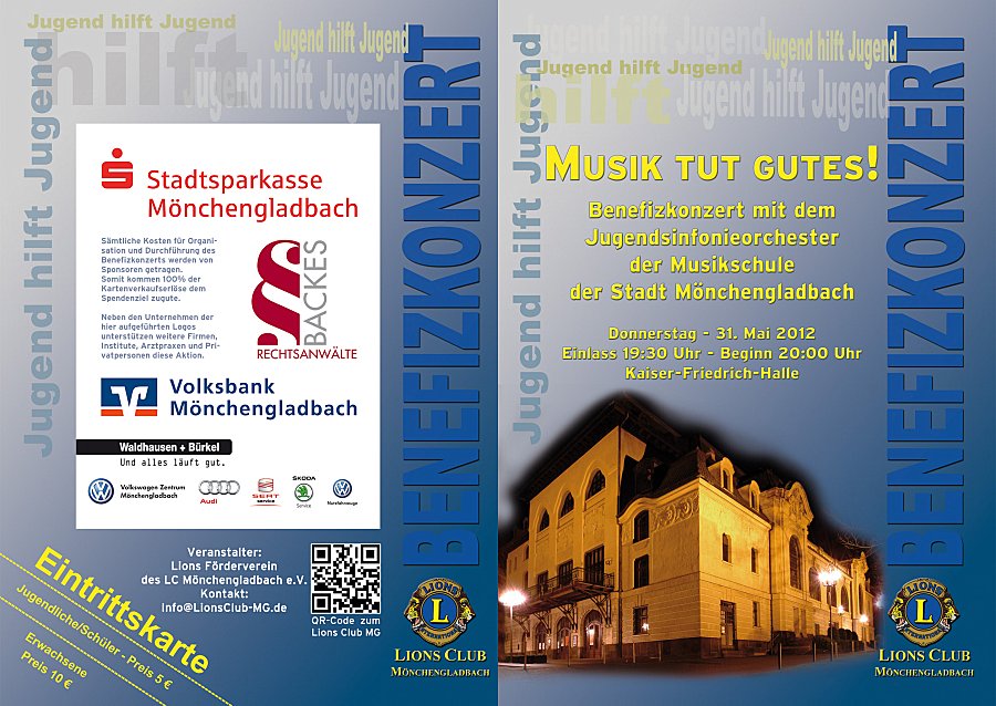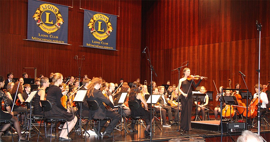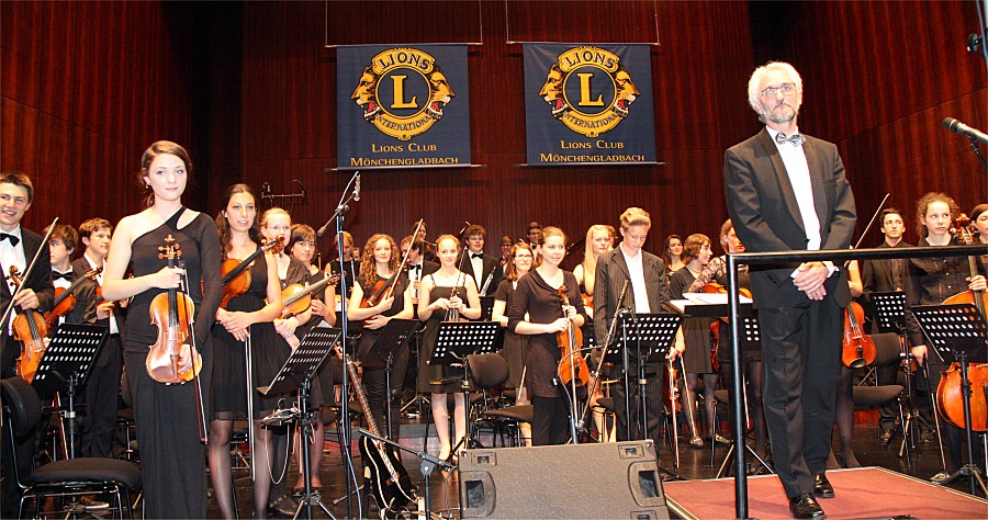 Unter dem Motto "Jugend hilft Jugend" wurde im Jahr 2004 vom Lions Club Mönchengladbach eine Benefizkonzertreihe initiiert, die - neben Spenden für regionale Jugendprojekte - auch den musizierenden Jugendlichen zugute kommt. Ein Teil des Erlöses aus dem diesjährigen Benefizkonzert soll die derzeit extrem knappen öffentlichen Fördermittel ausgleichen und zur Pflege, Reparatur und Neubeschaffung von Musikinstrumenten, Hilfsmitteln und Notenmaterial des Jugendsinfonieorchesters dienen. Der größere Teil des Erlöses kommt jedoch sozial nicht so gut gestellten Kindern in einer Jugendeinrichtung für Freizeit- und Lernhilfe im Stadtteil Lürripp zugute. Hier wird ein Geldbetrag zur Verfügung gestellt, der es dem Betreuerteam ermöglicht, mehr als ein ganzes Jahr frische und gesunde Lebensmittel für das tägliche gemeinsame Kochen mit den Kindern einzukaufen. ![]() Durch großzügige Geld- und Sachspenden von Banken, Firmen und Privatpersonen konnten sämtliche Kosten für Organisation und Durchführung des Benefizkonzertes gedeckt werden. Somit kommen - nach Abzug der unvermeidlichen Umsatzsteuer für das Finanzamt - 100 % der Erlöse aus dem Kartenverkauf den Jugendlichen zugute. |