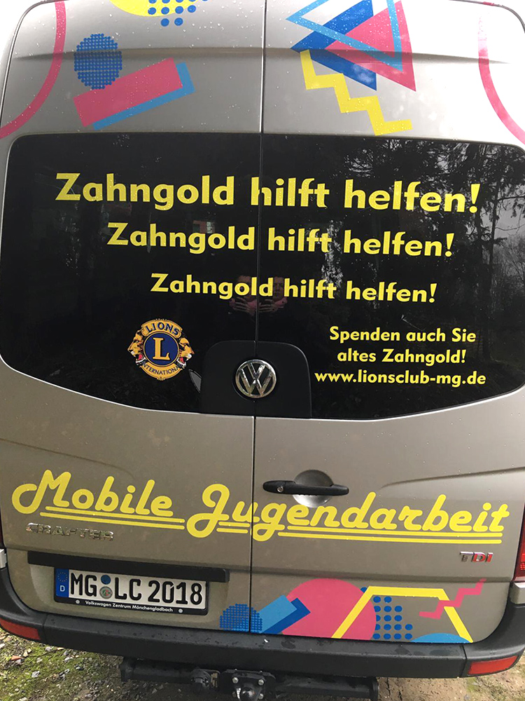 Das vom Förderverein der Lions gestiftete Fahrzeug für mobile Kinder- und Jugendarbeit wurde in Zusammenarbeit mit den Jugendlichen und einem Street Art Künstler gestaltet und verweist am Heck deutlich auf die Herkunft der Spenden...